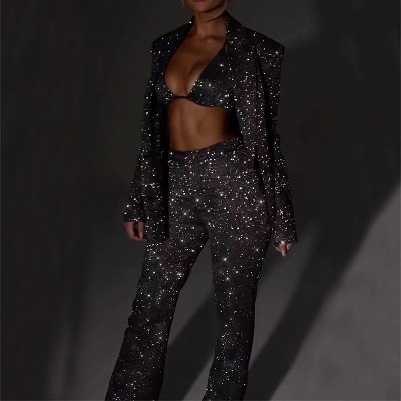 3pcs Shiny Long-sleeved Suit With Bra Lapel Blazer And Straight-leg Trousers Fashion Party Jacket Set For Women Clothing